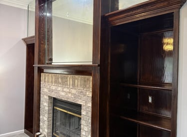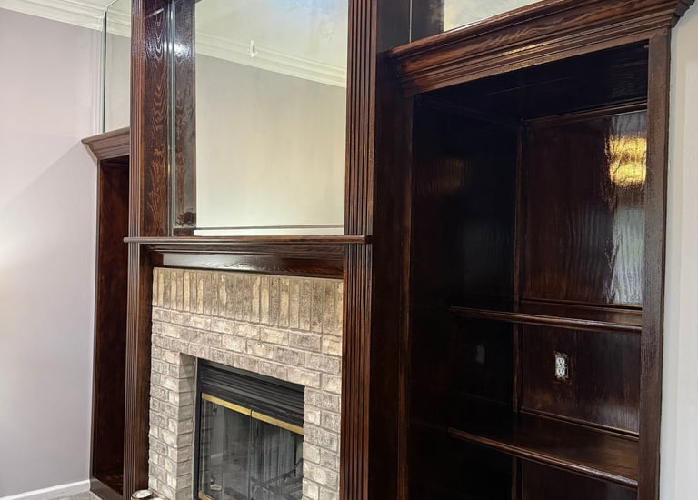 A dark stained fireplace complements elegant built-in bookcases beautifully.